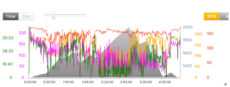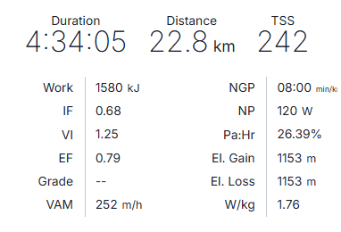 Los datos de la carrera respaldan el relato. Durante la primera mitad, el ritmo ajustado al desnivel (NGP) se mantuvo estable, con un factor de intensidad (IF) relativamente alto para una prueba de trail de esta duración. Esto puede indicarnos que las zonas de entrenamiento deben ser revisadas.